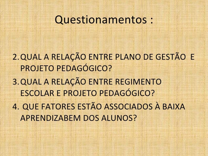 9. 10. Questionamentos : <ul><li>  </li></ul><ul><li>QUAL A RELAÇÃO ENTRE PLANO DE GESTÃO E PROJETO PEDAGÓGICO? </li></ul><ul><li>QUAL A RELAÇÃO ENTRE REGIMENTO ESCOLAR E PROJETO PEDAGÓGICO? </li></ul><ul><li>QUE FATORES ESTÃO ASSOCIADOS À BAIXA APRENDIZABEM DOS ALUNOS? </li></ul>