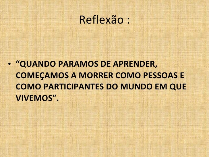 10. 11. Reflexão : <ul><li>“ QUANDO PARAMOS DE APRENDER, COMEÇAMOS A MORRER COMO PESSOAS E COMO PARTICIPANTES DO MUNDO EM QUE VIVEMOS”. </li></ul>