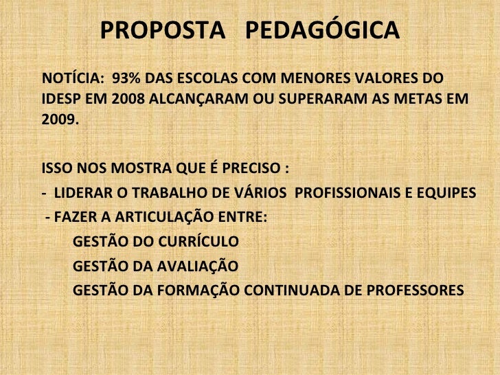 2. 3. PROPOSTA PEDAGÓGICA <ul><li>NOTÍCIA: 93% DAS ESCOLAS COM MENORES VALORES DO IDESP EM 2008 ALCANÇARAM OU SUPERARAM AS METAS EM 2009. </li></ul><ul><li>ISSO NOS MOSTRA QUE É PRECISO : </li></ul><ul><li>- LIDERAR O TRABALHO DE VÁRIOS PROFISSIONAIS E EQUIPES </li></ul><ul><li> - FAZER A ARTICULAÇÃO ENTRE: </li></ul><ul><li>GESTÃO DO CURRÍCULO </li></ul><ul><li>GESTÃO DA AVALIAÇÃO </li></ul><ul><li>GESTÃO DA FORMAÇÃO CONTINUADA DE PROFESSORES </li></ul><ul><li>  </li></ul>