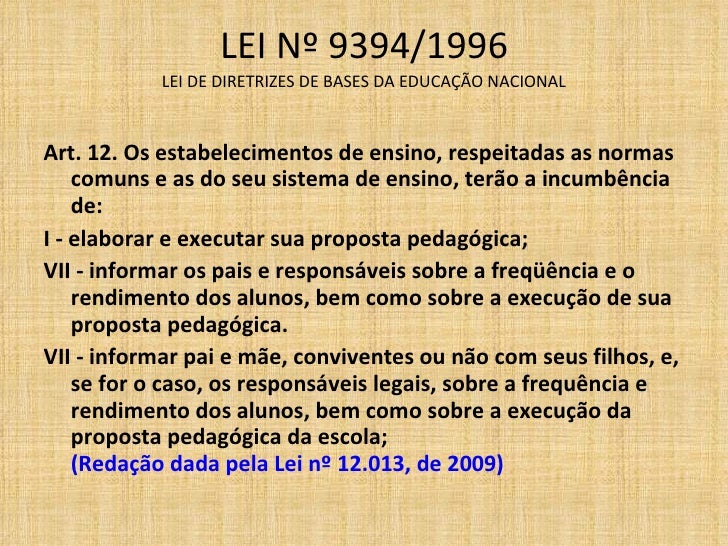 3. 4. LEI Nº 9394/1996 LEI DE DIRETRIZES DE BASES DA EDUCAÇÃO NACIONAL <ul><li>Art. 12. Os estabelecimentos de ensino, respeitadas as normas comuns e as do seu sistema de ensino, terão a incumbência de: </li></ul><ul><li>I - elaborar e executar sua proposta pedagógica; </li></ul><ul><li>VII - informar os pais e responsáveis sobre a freqüência e o rendimento dos alunos, bem como sobre a execução de sua proposta pedagógica. </li></ul><ul><li>VII - informar pai e mãe, conviventes ou não com seus filhos, e, se for o caso, os responsáveis legais, sobre a frequência e rendimento dos alunos, bem como sobre a execução da proposta pedagógica da escola; (Redação dada pela Lei nº 12.013, de 2009) </li></ul>