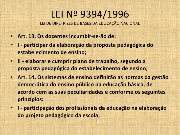 4. 5. LEI Nº 9394/1996 LEI DE DIRETRIZES DE BASES DA EDUCAÇÃO NACIONAL <ul><li>Art. 13. Os docentes incumbir-se-ão de: </li></ul><ul><li>I - participar da elaboração da proposta pedagógica do estabelecimento de ensino; </li></ul><ul><li>II - elaborar e cumprir plano de trabalho, segundo a proposta pedagógica do estabelecimento de ensino; </li></ul><ul><li>Art. 14. Os sistemas de ensino definirão as normas da gestão democrática do ensino público na educação básica, de acordo com as suas peculiaridades e conforme os seguintes princípios: </li></ul><ul><li>I - participação dos profissionais da educação na elaboração do projeto pedagógico da escola; </li></ul>