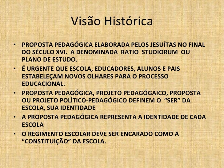 5. 6. Visão Histórica <ul><li>PROPOSTA PEDAGÓGICA ELABORADA PELOS JESUÍTAS NO FINAL DO SÉCULO XVI. A DENOMINADA RATIO STUDIORUM OU PLANO DE ESTUDO. </li></ul><ul><li>É URGENTE QUE ESCOLA, EDUCADORES, ALUNOS E PAIS ESTABELEÇAM NOVOS OLHARES PARA O PROCESSO EDUCACIONAL. </li></ul><ul><li>PROPOSTA PEDAGÓGICA, PROJETO PEDAGÓGAICO, PROPOSTA OU PROJETO POLÍTICO-PEDAGÓGICO DEFINEM O “SER” DA ESCOLA, SUA IDENTIDADE </li></ul><ul><li>A PROPOSTA PEDAGÓGICA REPRESENTA A IDENTIDADE DE CADA ESCOLA </li></ul><ul><li>O REGIMENTO ESCOLAR DEVE SER ENCARADO COMO A “CONSTITUIÇÃO” DA ESCOLA. </li></ul>