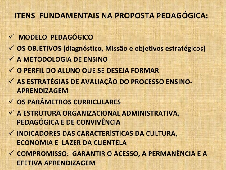 6. 7. ITENS FUNDAMENTAIS NA PROPOSTA PEDAGÓGICA: <ul><li>MODELO PEDAGÓGICO </li></ul><ul><li>OS OBJETIVOS (diagnóstico, Missão e objetivos estratégicos) </li></ul><ul><li>A METODOLOGIA DE ENSINO </li></ul><ul><li>O PERFIL DO ALUNO QUE SE DESEJA FORMAR </li></ul><ul><li>AS ESTRATÉGIAS DE AVALIAÇÃO DO PROCESSO ENSINO-APRENDIZAGEM </li></ul><ul><li>OS PARÂMETROS CURRICULARES </li></ul><ul><li>A ESTRUTURA ORGANIZACIONAL ADMINISTRATIVA, PEDAGÓGICA E DE CONVIVÊNCIA </li></ul><ul><li>INDICADORES DAS CARACTERÍSTICAS DA CULTURA, ECONOMIA E LAZER DA CLIENTELA </li></ul><ul><li>COMPROMISSO: GARANTIR O ACESSO, A PERMANÊNCIA E A EFETIVA APRENDIZAGEM </li></ul>
