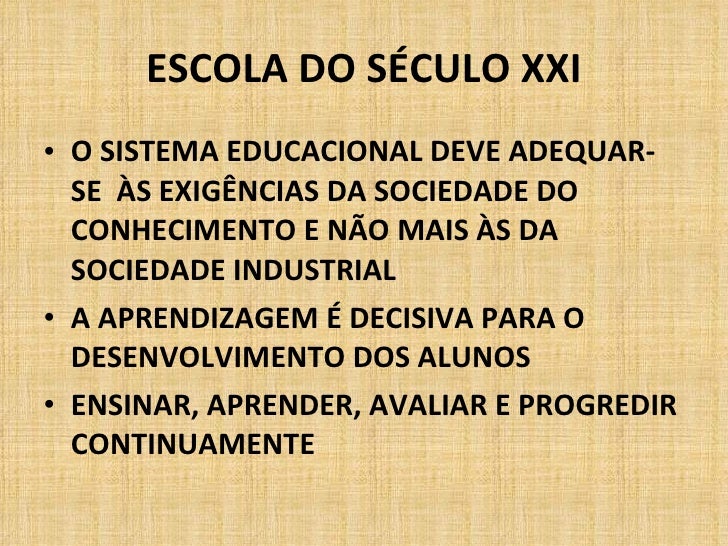 7. 8. ESCOLA DO SÉCULO XXI <ul><li>O SISTEMA EDUCACIONAL DEVE ADEQUAR-SE ÀS EXIGÊNCIAS DA SOCIEDADE DO CONHECIMENTO E NÃO MAIS ÀS DA SOCIEDADE INDUSTRIAL </li></ul><ul><li>A APRENDIZAGEM É DECISIVA PARA O DESENVOLVIMENTO DOS ALUNOS </li></ul><ul><li>ENSINAR, APRENDER, AVALIAR E PROGREDIR CONTINUAMENTE </li></ul>