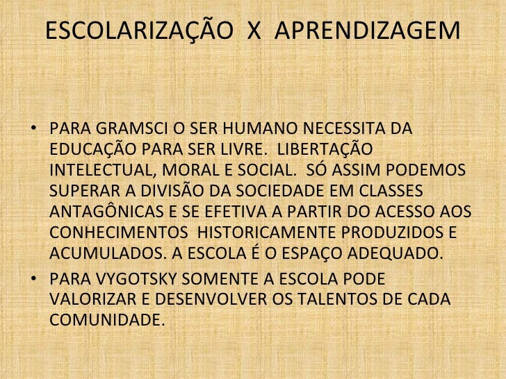 8. 9. ESCOLARIZAÇÃO X APRENDIZAGEM <ul><li>  </li></ul><ul><li>PARA GRAMSCI O SER HUMANO NECESSITA DA EDUCAÇÃO PARA SER LIVRE. LIBERTAÇÃO INTELECTUAL, MORAL E SOCIAL. SÓ ASSIM PODEMOS SUPERAR A DIVISÃO DA SOCIEDADE EM CLASSES ANTAGÔNICAS E SE EFETIVA A PARTIR DO ACESSO AOS CONHECIMENTOS HISTORICAMENTE PRODUZIDOS E ACUMULADOS. A ESCOLA É O ESPAÇO ADEQUADO. </li></ul><ul><li>PARA VYGOTSKY SOMENTE A ESCOLA PODE VALORIZAR E DESENVOLVER OS TALENTOS DE CADA COMUNIDADE. </li></ul>