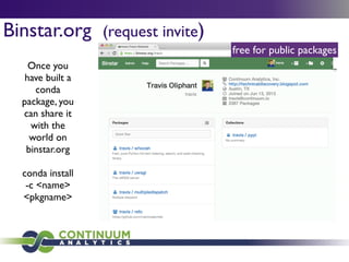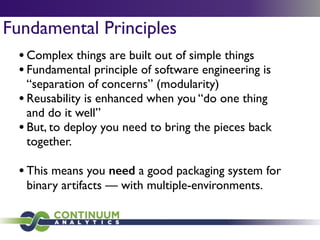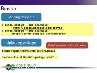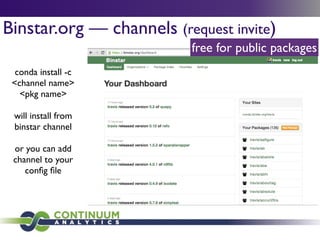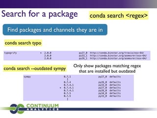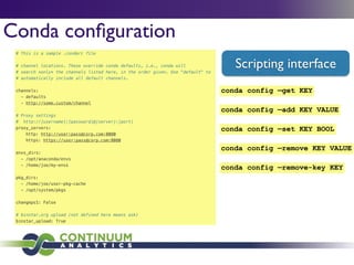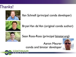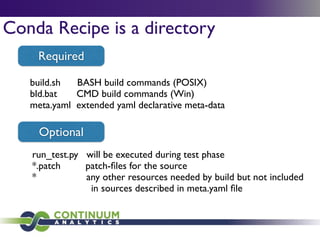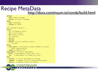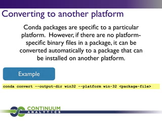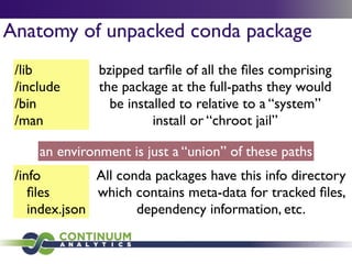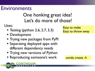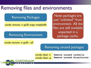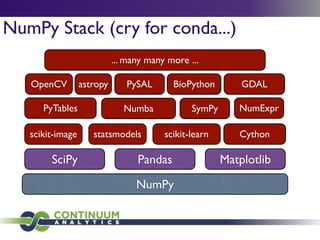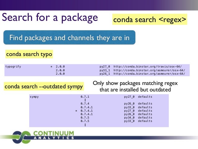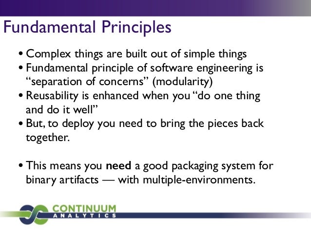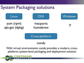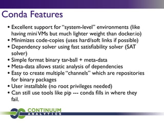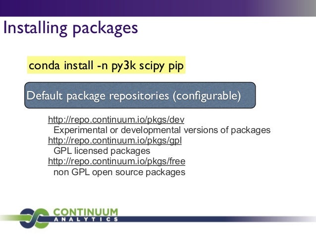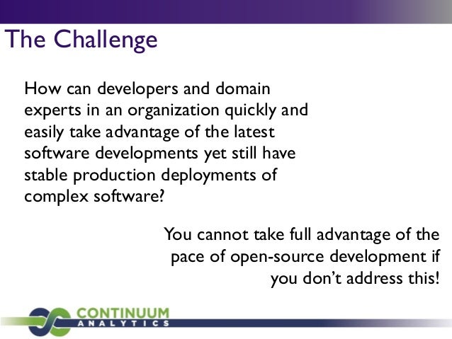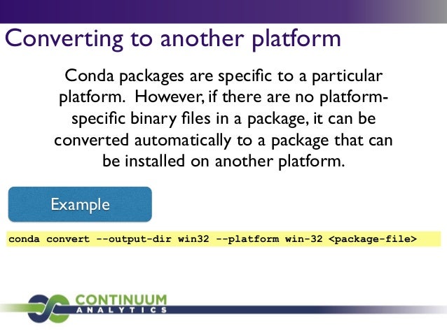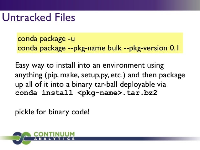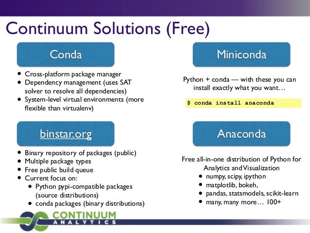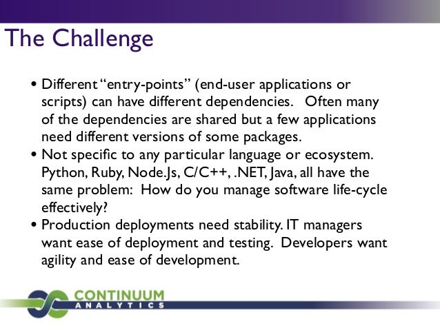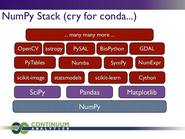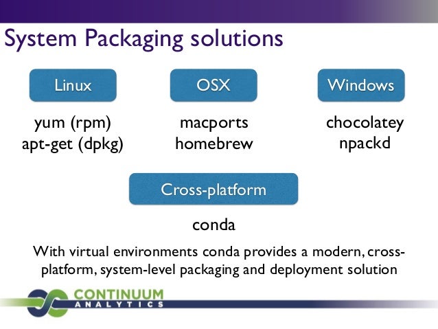Download with free trialConda is a cross-platform package manager that lets you quickly and easily build environments containing complicated software stacks. It was built to manage the NumPy stack in Python but can be used to manage any complex software dependencies.