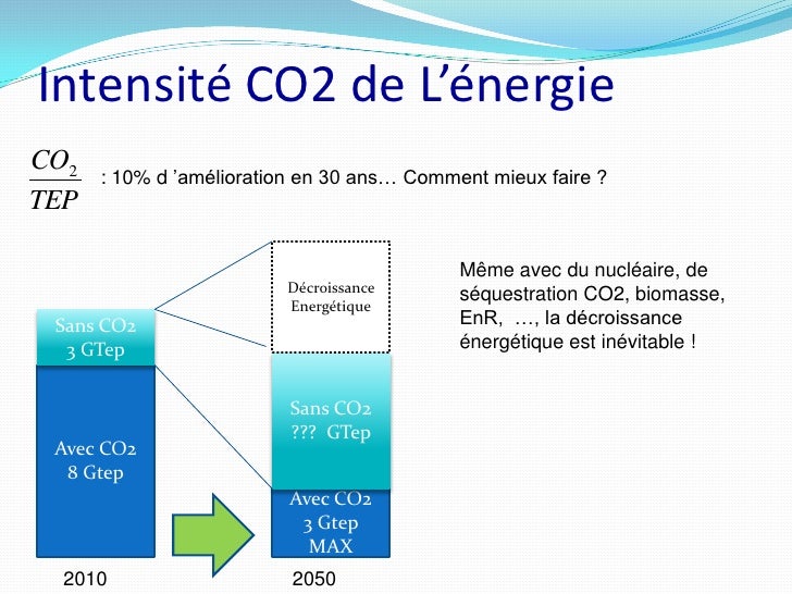 10. 10. Intensité CO2 de L’énergie CO2 : 10% d ’amélioration en 30 ans… Comment mieux faire ? TEP Même avec du nucléaire, de Décroissance séquestration CO2, biomasse, Energétique Sans CO2 EnR, …, la décroissance 3 GTep énergétique est inévitable ! Sans CO2 ??? GTep Avec CO2 8 Gtep Avec CO2 3 Gtep MAX 2010 2050