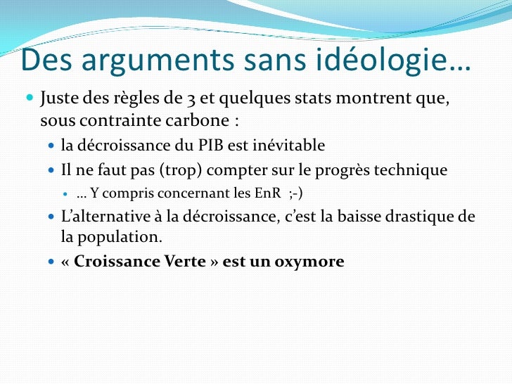 11. 11. Des arguments sans idéologie…  Juste des règles de 3 et quelques stats montrent que, sous contrainte carbone :  la décroissance du PIB est inévitable  Il ne faut pas (trop) compter sur le progrès technique  … Y compris concernant les EnR ;-)  L’alternative à la décroissance, c’est la baisse drastique de la population.  « Croissance Verte » est un oxymore