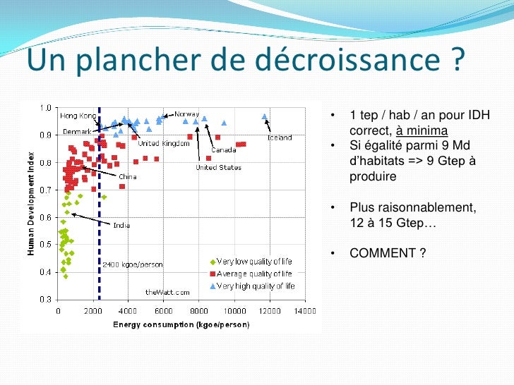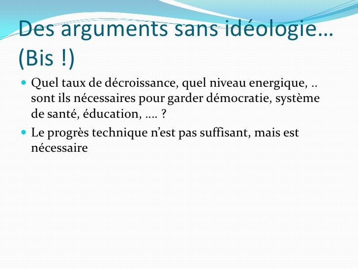 12. 12. Des arguments sans idéologie… (Bis !)  Quel taux de décroissance, quel niveau energique, .. sont ils nécessaires pour garder démocratie, système de santé, éducation, …. ?  Le progrès technique n’est pas suffisant, mais est nécessaire