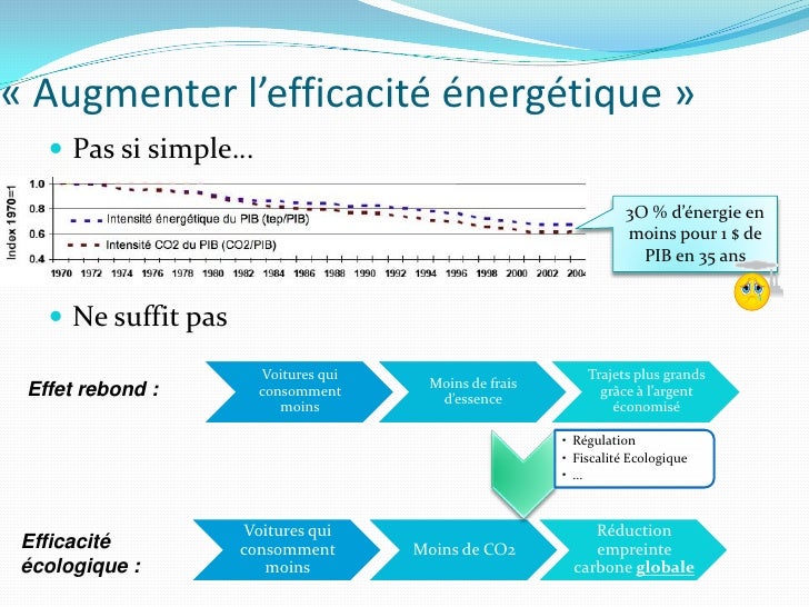 13. 13. « Augmenter l’efficacité énergétique »  Pas si simple… 3O % d’énergie en moins pour 1 $ de PIB en 35 ans  Ne suffit pas Voitures qui Trajets plus grands Moins de frais Effet rebond : consomment d’essence grâce à l’argent moins économisé • Régulation • Fiscalité Ecologique • … Voitures qui Réduction Efficacité consomment Moins de CO2 empreinte écologique : moins carbone globale