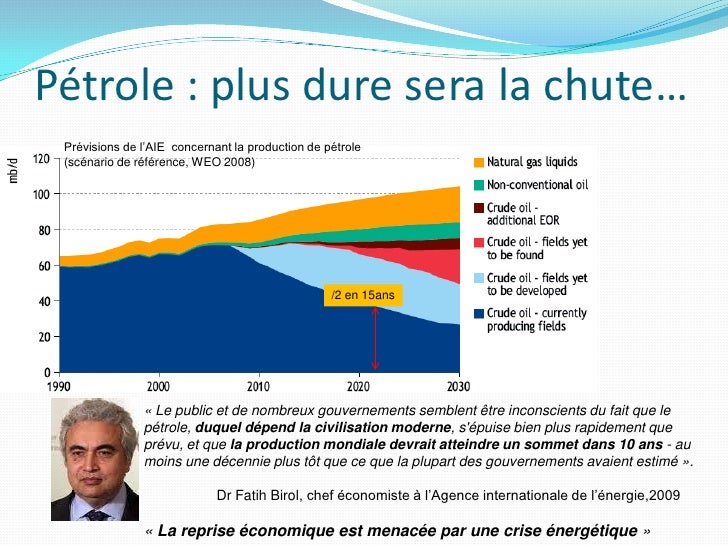 15. 15. Pétrole : plus dure sera la chute… Prévisions de l’AIE concernant la production de pétrole (scénario de référence, WEO 2008) /2 en 15ans « Le public et de nombreux gouvernements semblent être inconscients du fait que le pétrole, duquel dépend la civilisation moderne, s'épuise bien plus rapidement que prévu, et que la production mondiale devrait atteindre un sommet dans 10 ans - au moins une décennie plus tôt que ce que la plupart des gouvernements avaient estimé ». Dr Fatih Birol, chef économiste à l’Agence internationale de l’énergie,2009 « La reprise économique est menacée par une crise énergétique »