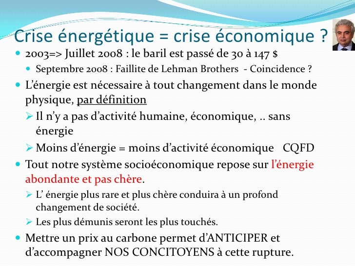 16. 16. Crise énergétique = crise économique ?  2003=> Juillet 2008 : le baril est passé de 30 à 147 $  Septembre 2008 : Faillite de Lehman Brothers - Coincidence ?  L’énergie est nécessaire à tout changement dans le monde physique, par définition  Il n’y a pas d’activité humaine, économique, .. sans énergie  Moins d’énergie = moins d’activité économique CQFD  Tout notre système socioéconomique repose sur l’énergie abondante et pas chère.  L’ énergie plus rare et plus chère conduira à un profond changement de société.  Les plus démunis seront les plus touchés.  Mettre un prix au carbone permet d’ANTICIPER et d’accompagner NOS CONCITOYENS à cette rupture.