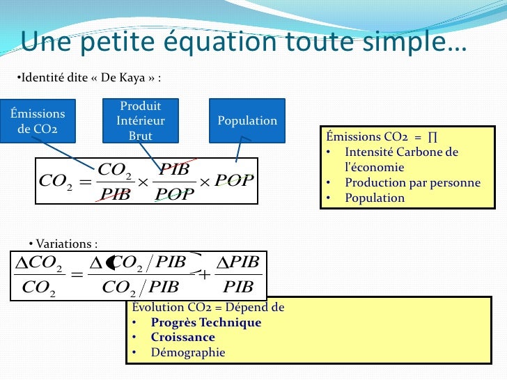 2. 2. Une petite équation toute simple… •Identité dite « De Kaya » : Produit Émissions Intérieur Population de CO2 Brut Émissions CO2 = ∏ • Intensité Carbone de CO2 PIB l'économie CO2 POP • Production par personne PIB POP • Population • Variations : CO2 CO2 PIB PIB CO2 CO2 PIB PIB Évolution CO2 = Dépend de • Progrès Technique • Croissance • Démographie