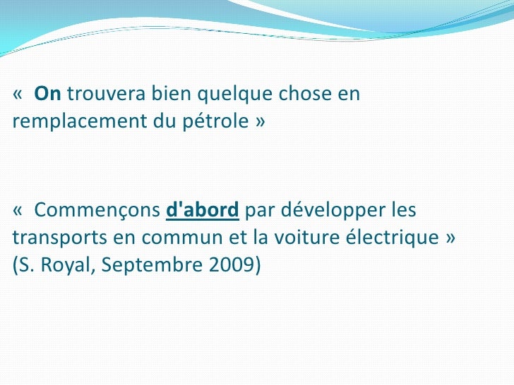 21. 21. « On trouvera bien quelque chose en remplacement du pétrole » « Commençons d'abord par développer les transports en commun et la voiture électrique » (S. Royal, Septembre 2009)