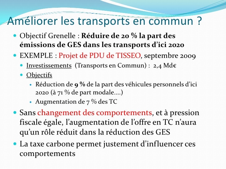 22. 22. Améliorer les transports en commun ?  Objectif Grenelle : Réduire de 20 % la part des émissions de GES dans les transports d’ici 2020  EXEMPLE : Projet de PDU de TISSEO, septembre 2009  Investissements (Transports en Commun) : 2,4 Md€  Objectifs  Réduction de 9 % de la part des véhicules personnels d’ici 2020 (à 71 % de part modale....)  Augmentation de 7 % des TC  Sans changement des comportements, et à pression fiscale égale, l’augmentation de l’offre en TC n’aura qu’un rôle réduit dans la réduction des GES  La taxe carbone permet justement d’influencer ces comportements