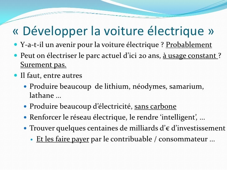 23. 23. « Développer la voiture électrique »  Y-a-t-il un avenir pour la voiture électrique ? Probablement  Peut on électriser le parc actuel d’ici 20 ans, à usage constant ? Surement pas.  Il faut, entre autres  Produire beaucoup de lithium, néodymes, samarium, lathane …  Produire beaucoup d’électricité, sans carbone  Renforcer le réseau électrique, le rendre ‘intelligent’, …  Trouver quelques centaines de milliards d’€ d’investissement  Et les faire payer par le contribuable / consommateur …