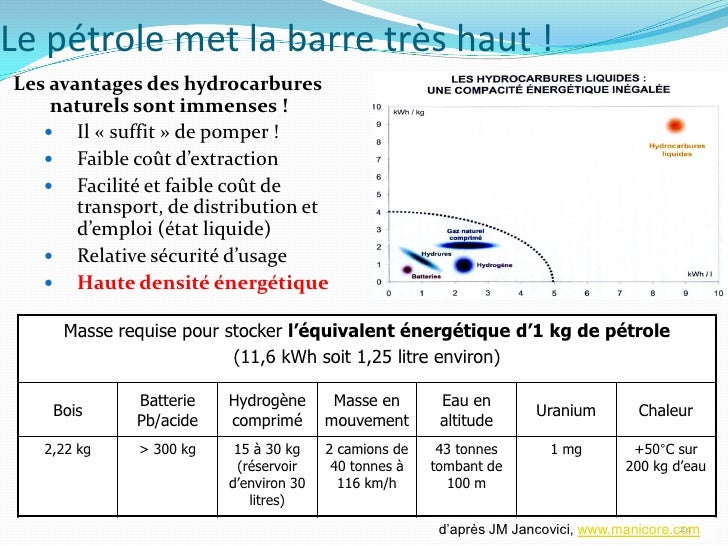 24. 24. Le pétrole met la barre très haut ! Les avantages des hydrocarbures naturels sont immenses !  Il « suffit » de pomper !  Faible coût d’extraction  Facilité et faible coût de transport, de distribution et d’emploi (état liquide)  Relative sécurité d’usage  Haute densité énergétique Masse requise pour stocker l’équivalent énergétique d’1 kg de pétrole (11,6 kWh soit 1,25 litre environ) Batterie Hydrogène Masse en Eau en Bois Uranium Chaleur Pb/acide comprimé mouvement altitude 2,22 kg > 300 kg 15 à 30 kg 2 camions de 43 tonnes 1 mg +50°C sur (réservoir 40 tonnes à tombant de 200 kg d’eau d’environ 30 116 km/h 100 m litres) d’après JM Jancovici, www.manicore.com 24