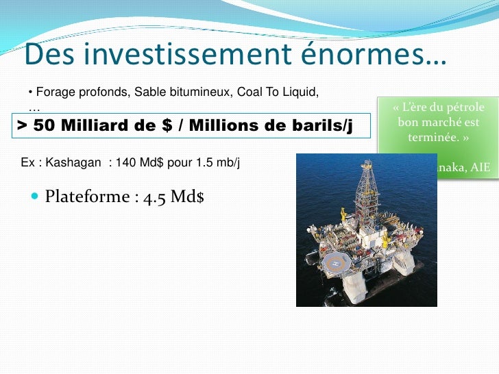 25. 25. Des investissement énormes… • Forage profonds, Sable bitumineux, Coal To Liquid, … « L’ère du pétrole > 50 Milliard de $ / Millions de barils/j bon marché est terminée. » Ex : Kashagan : 140 Md$ pour 1.5 mb/j Nobuo Tanaka, AIE  Plateforme : 4.5 Md$