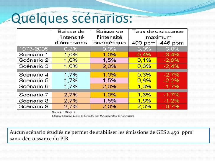 9. 9. Quelques scénarios: Source : Minqi Li Climate Change, Limits to Growth, and the Imperative for Socialism Aucun scénario étudiés ne permet de stabiliser les émissions de GES à 450 ppm sans décroissance du PIB