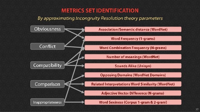 The document discusses a model related to humor, focusing on various factors such as relatedness, dissimilarity, ambiguity, and uncommonness. It highlights the importance of these elements in evaluating humor performance. The emphasis is on understanding the relationships between different concepts in humor assessment.