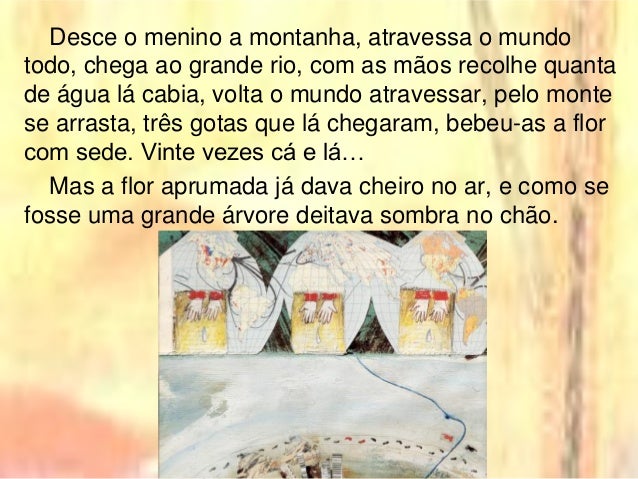 10. 10. Desce o menino a montanha, atravessa o mundo todo, chega ao grande rio, com as mãos recolhe quanta de água lá cabia, volta o mundo atravessar, pelo monte se arrasta, três gotas que lá chegaram, bebeu-as a flor com sede. Vinte vezes cá e lá… Mas a flor aprumada já dava cheiro no ar, e como se fosse uma grande árvore deitava sombra no chão.