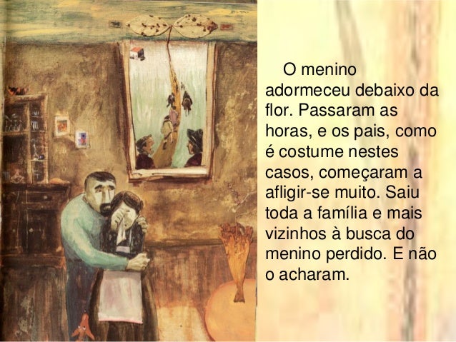 11. 11. O menino adormeceu debaixo da flor. Passaram as horas, e os pais, como é costume nestes casos, começaram a afligir-se muito. Saiu toda a família e mais vizinhos à busca do menino perdido. E não o acharam.