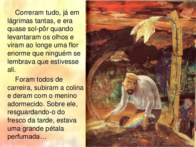 12. 12. Correram tudo, já em lágrimas tantas, e era quase sol-pôr quando levantaram os olhos e viram ao longe uma flor enorme que ninguém se lembrava que estivesse ali. Foram todos de carreira, subiram a colina e deram com o menino adormecido. Sobre ele, resguardando-o do fresco da tarde, estava uma grande pétala perfumada…