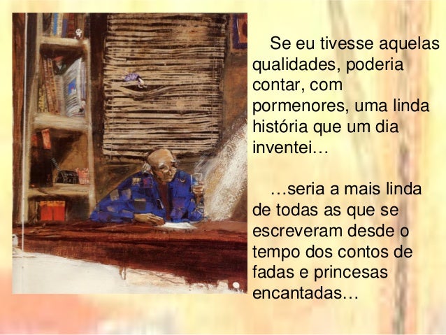 3. 3. Se eu tivesse aquelas qualidades, poderia contar, com pormenores, uma linda história que um dia inventei… …seria a mais linda de todas as que se escreveram desde o tempo dos contos de fadas e princesas encantadas…