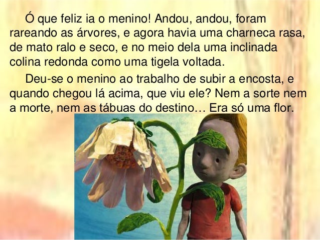 8. 8. Ó que feliz ia o menino! Andou, andou, foram rareando as árvores, e agora havia uma charneca rasa, de mato ralo e seco, e no meio dela uma inclinada colina redonda como uma tigela voltada. Deu-se o menino ao trabalho de subir a encosta, e quando chegou lá acima, que viu ele? Nem a sorte nem a morte, nem as tábuas do destino… Era só uma flor.