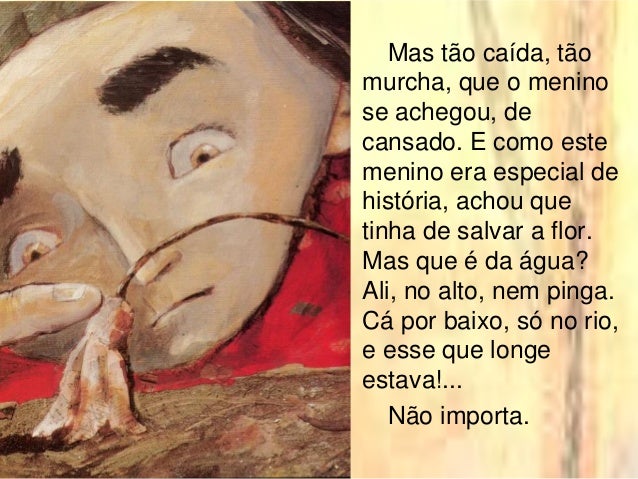 9. 9. Mas tão caída, tão murcha, que o menino se achegou, de cansado. E como este menino era especial de história, achou que tinha de salvar a flor. Mas que é da água? Ali, no alto, nem pinga. Cá por baixo, só no rio, e esse que longe estava!... Não importa.