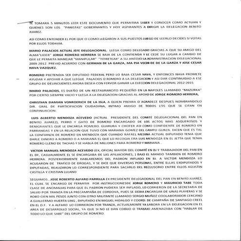 Documento que circula en internet con acusaciones contra Jorge Romero Herrera, candidato del PAN a Jefe Delegacional de Benito Juárez, en la Ciudad de México.