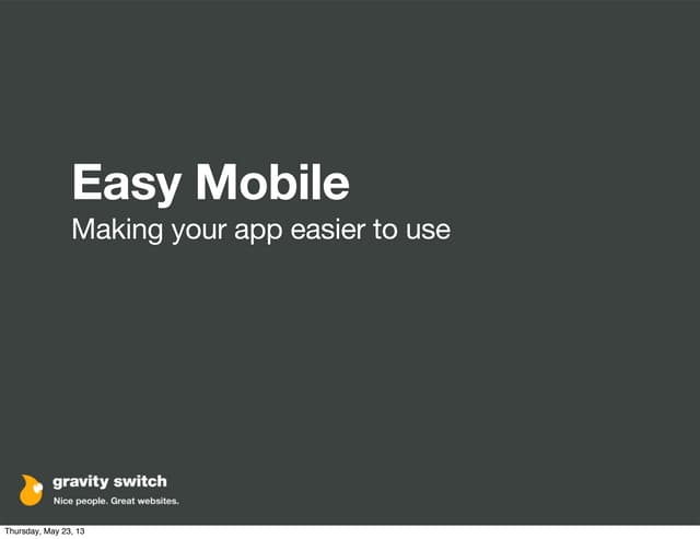 Kids Make sure the app loads fast. Don’t make the user wait. Correct touches should let you know right away. A simple sound effect works wonders to tell the user they’re doing the right thing. If touches don’t effect action in about 1 second or less, they will feel like they’re either incorrect or broken. Limit use of “good job,” “way to go,” etc. It’s a video game, not a phone call with Grandma.