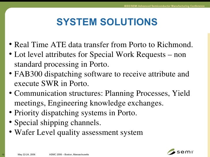 SYSTEM SOLUTIONS <ul><li>Real Time ATE data transfer from Porto to Richmond. </li></ul><ul><li>Lot level attributes for Sp...
