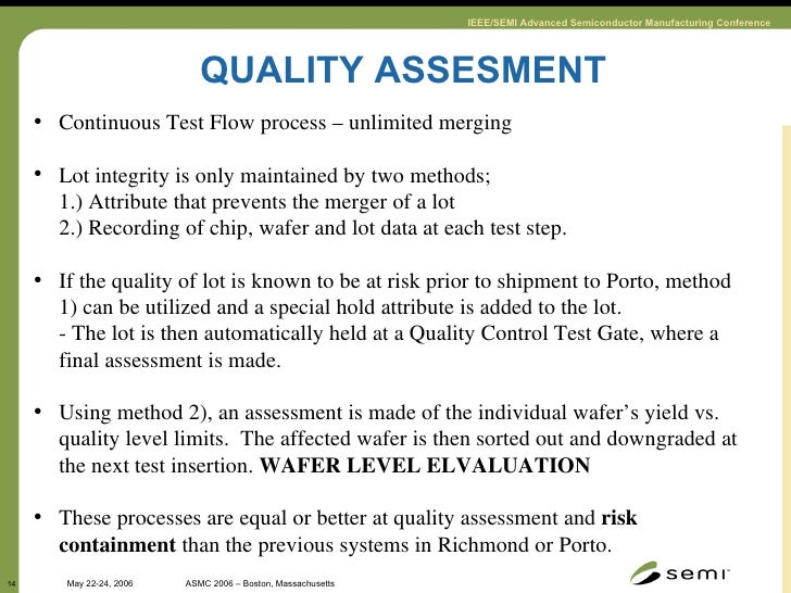 14. 14. QUALITY ASSESMENT <ul><li>Continuous Test Flow process – unlimited merging </li></ul><ul><li>Lot integrity is only maintained by two methods; </li></ul><ul><li>1.) Attribute that prevents the merger of a lot </li></ul><ul><li>2.) Recording of chip, wafer and lot data at each test step. </li></ul><ul><li>If the quality of lot is known to be at risk prior to shipment to Porto, method 1) can be utilized and a special hold attribute is added to the lot. </li></ul><ul><li>- The lot is then automatically held at a Quality Control Test Gate, where a final assessment is made. </li></ul><ul><li>Using method 2), an assessment is made of the individual wafer’s yield vs. quality level limits. The affected wafer is then sorted out and downgraded at the next test insertion. WAFER LEVEL ELVALUATION </li></ul><ul><li>These processes are equal or better at quality assessment and risk containment than the previous systems in Richmond or Porto. </li></ul>