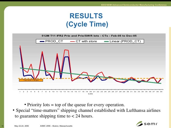 15. 15. RESULTS (Cycle Time) <ul><ul><li>Priority lots = top of the queue for every operation. </li></ul></ul><ul><li>Special “time-matters” shipping channel established with Lufthansa airlines to guarantee shipping time to < 24 hours. </li></ul>