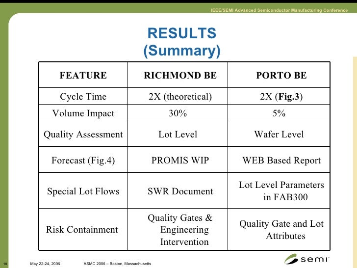18. 18. RESULTS (Summary) Quality Gate and Lot Attributes Quality Gates & Engineering Intervention Risk Containment Lot Level Parameters in FAB300 SWR Document Special Lot Flows WEB Based Report PROMIS WIP Forecast (Fig.4) Wafer Level Lot Level Quality Assessment 5% 30% Volume Impact 2X ( Fig.3 ) 2X (theoretical) Cycle Time PORTO BE RICHMOND BE FEATURE