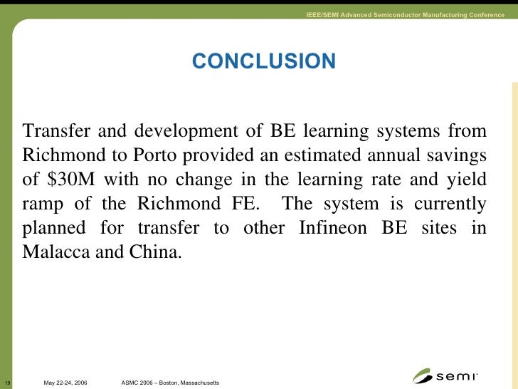 19. 19. CONCLUSION Transfer and development of BE learning systems from Richmond to Porto provided an estimated annual savings of $30M with no change in the learning rate and yield ramp of the Richmond FE. The system is currently planned for transfer to other Infineon BE sites in Malacca and China.