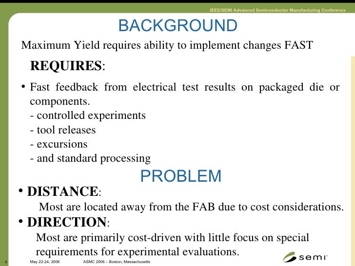 6. 6. <ul><li>Maximum Yield requires ability to implement changes FAST </li></ul><ul><li>REQUIRES : </li></ul><ul><li>Fast feedback from electrical test results on packaged die or components. </li></ul><ul><li>- controlled experiments </li></ul><ul><li>- tool releases </li></ul><ul><li>- excursions </li></ul><ul><li>- and standard processing </li></ul>PROBLEM BACKGROUND <ul><li>DISTANCE : </li></ul><ul><ul><li>Most are located away from the FAB due to cost considerations. </li></ul></ul><ul><li>DIRECTION : </li></ul><ul><ul><li>Most are primarily cost-driven with little focus on special requirements for experimental evaluations. </li></ul></ul>