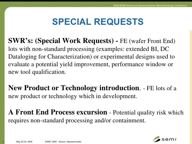 7. 7. SPECIAL REQUESTS SWR’s: (Special Work Requests) - FE (wafer Front End) lots with non-standard processing (examples: extended BI, DC Dataloging for Characterization) or experimental designs used to evaluate a potential yield improvement, performance window or new tool qualification. New Product or Technology introduction . - FE lots of a new product or technology which in development. A Front End Process excursion - Potential quality risk which requires non-standard processing and/or containment.