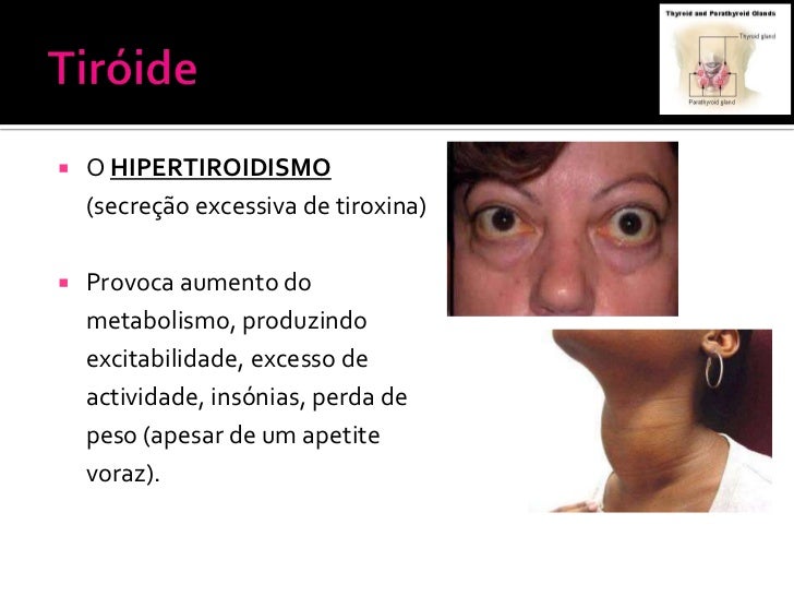 17. 17.  O HIPERTIROIDISMO (secreção excessiva de tiroxina) Provoca aumento do metabolismo, produzindo excitabilidade, excesso de actividade, insónias, perda de peso (apesar de um apetite voraz).