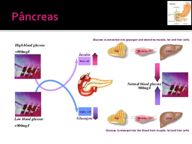 21. 21. Glucose is converted into glycogen and stored by muscle, fat and liver cellsHigh blood glucose>900mg/l Fat Muscle Liver Insulin Beta cell Normal blood glucose 900mg/l Al pha cellLow blood glucose Glucagon Fat Muscle Liver<900mg/l Glucose is released into the blood from muscle, fat and liver ce lls