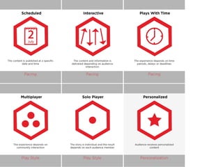 The document outlines a workshop activity for transmedia storytellers at the Conducttr Conference on October 17, 2014, in London. Participants will use card decks with characteristics and tropes to create a story experience based on prompts, with varying time limits for solo or team-based creations. It also encourages checking the transmedia playbook and emphasizes the importance of understanding player goals and roles in storytelling.