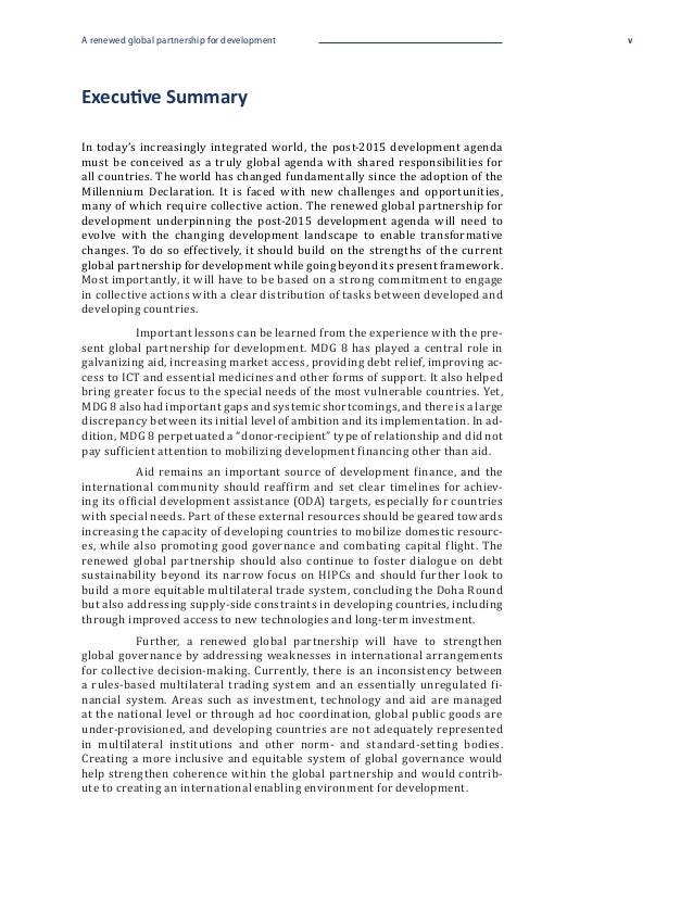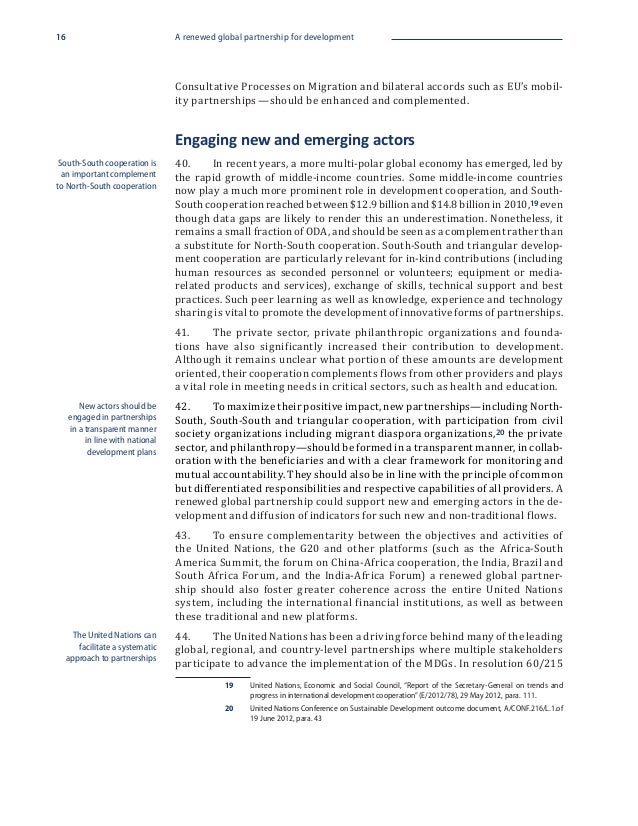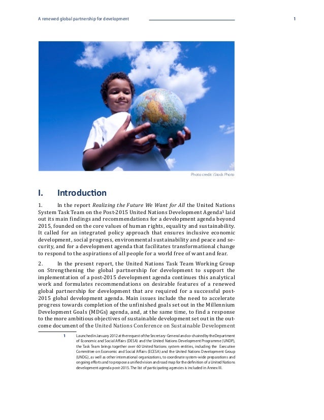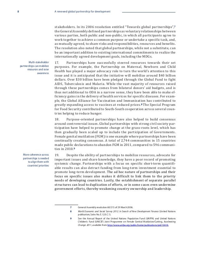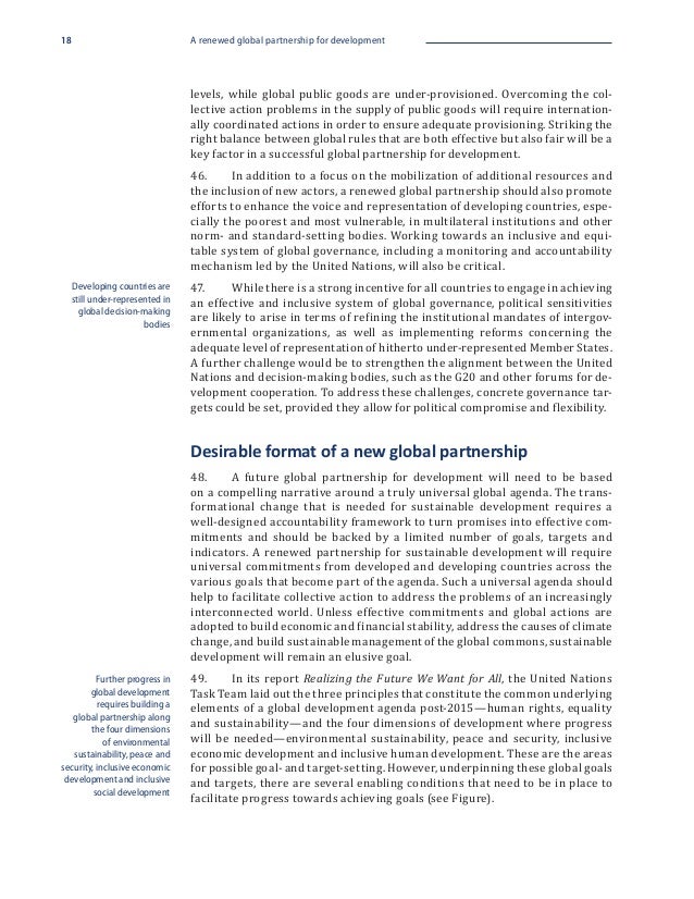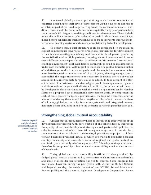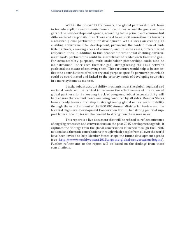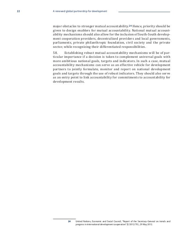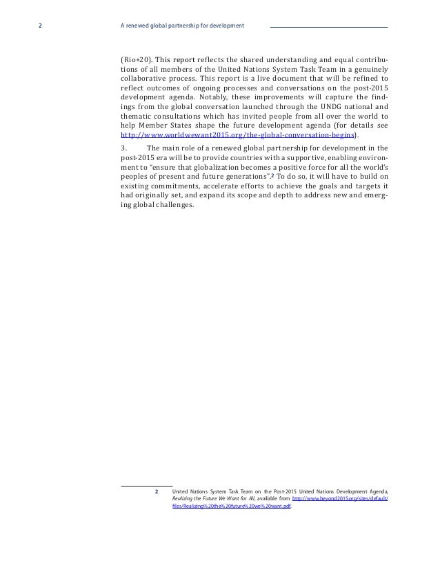In its second report, "A renewed global partnership for development," the UN System Task Team on the Post-2015 UN Development looks at the possible features for the global partnership for development in the post-2015 era. Building on a review of the current global partnership for development, as crystallized in Millennium Development Goal 8, the report provides recommendations on potential dimensions and contours of a renewed global partnership for development. In addition the report also provides some suggestions for a robust mutual accountability system.