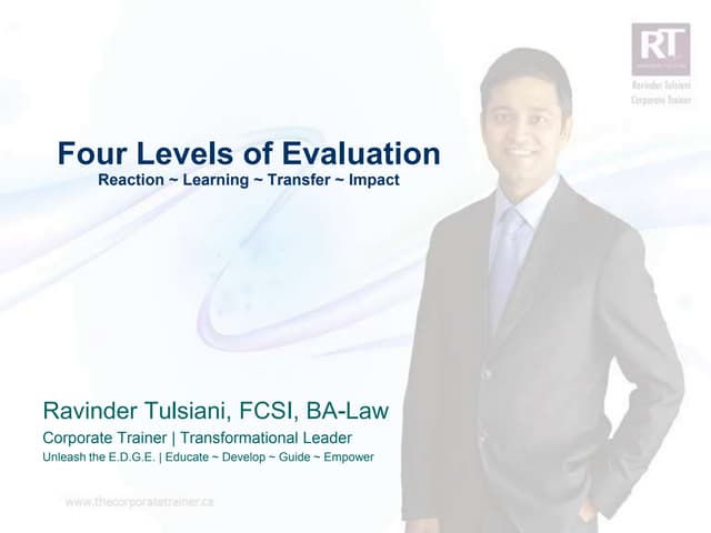 66. 66. References/Recommended Further Readings <ul><li>Donald Kirkpatrick, Evaluating Training Programs : The Four Levels , Berrett-Koehler Publishers. You can obtain this excellent book at this link : http://www.amazon.com/Evaluating-Training-Programs-Four-Levels/dp/1576753484/ref=sr_1_1?ie=UTF8&s=books&qid=1219800986&sr=1-1 </li></ul><ul><li>2. Jack J. Phillips and Patricia Phillips, In Action : Measuring Return On Investment , American Society for Training & Development. You can obtain this excellent book at this link : http://www.amazon.com/Action-Measuring-Return-Investment/dp/1562860089/ref=sr_1_3?ie=UTF8&s=books&qid=1219801000&sr=1-3 </li></ul><ul><li>Mary Broad and John Newstrom, Transfer of training: Action P acked S trategies to E nsure H igh P ayoff from T raining I nvestments , Addison-Wesley. You can obtain this excellent book at this link : http://www.amazon.com/Transfer-Training-Action-Packed-Strategies-Investments/dp/0738205672/ref=sr_1_1?ie=UTF8&s=books&qid=1219801069&sr=1-1 </li></ul>