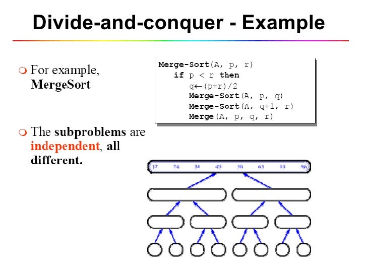 10. 10. Divide-and-conquer <ul><li>Divide-and-conquer method for algorithm design: </li></ul><ul><li>Divide : If the input size is too large to deal with in a straightforward manner, divide the problem into two or more disjoint subproblems </li></ul><ul><li>Conquer : conquer recursively to solve the subproblems </li></ul><ul><li>Combine : Take the solutions to the subproblems and “merge” these solutions into a solution for the original problem </li></ul>