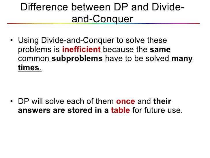 13. 13. Difference between DP and Divide-and-Conquer <ul><li>Using Divide-and-Conquer to solve these problems is inefficient because the same common subproblems have to be solved many times . </li></ul><ul><li>DP will solve each of them once and their answers are stored in a table for future use. </li></ul>