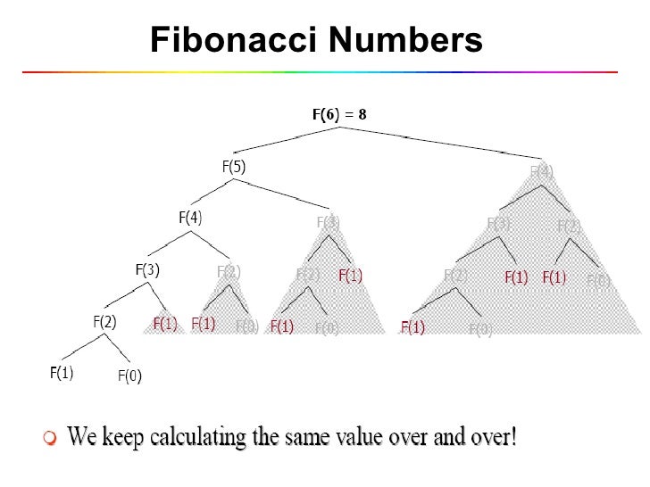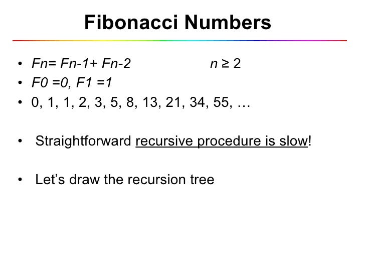 16. 16. Fibonacci Numbers <ul><li>Fn= Fn-1+ Fn-2 n ≥ 2 </li></ul><ul><li>F0 =0, F1 =1 </li></ul><ul><li>0, 1, 1, 2, 3, 5, 8, 13, 21, 34, 55, … </li></ul><ul><li>Straightforward recursive procedure is slow ! </li></ul><ul><li>Let’s draw the recursion tree </li></ul>