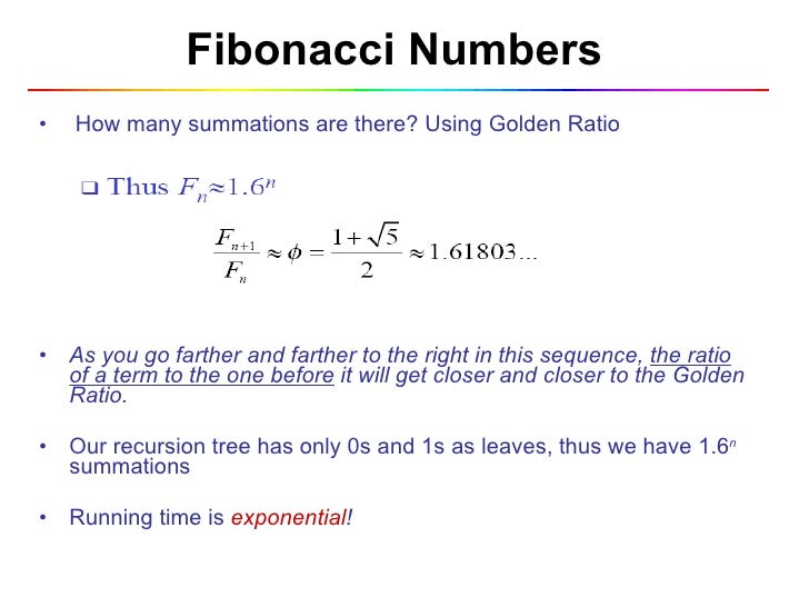 18. 18. Fibonacci Numbers <ul><li>How many summations are there? Using Golden Ratio </li></ul><ul><li>As you go farther and farther to the right in this sequence, the ratio of a term to the one before it will get closer and closer to the Golden Ratio. </li></ul><ul><li>Our recursion tree has only 0s and 1s as leaves, thus we have 1.6 n summations </li></ul><ul><li>Running time is exponential ! </li></ul>