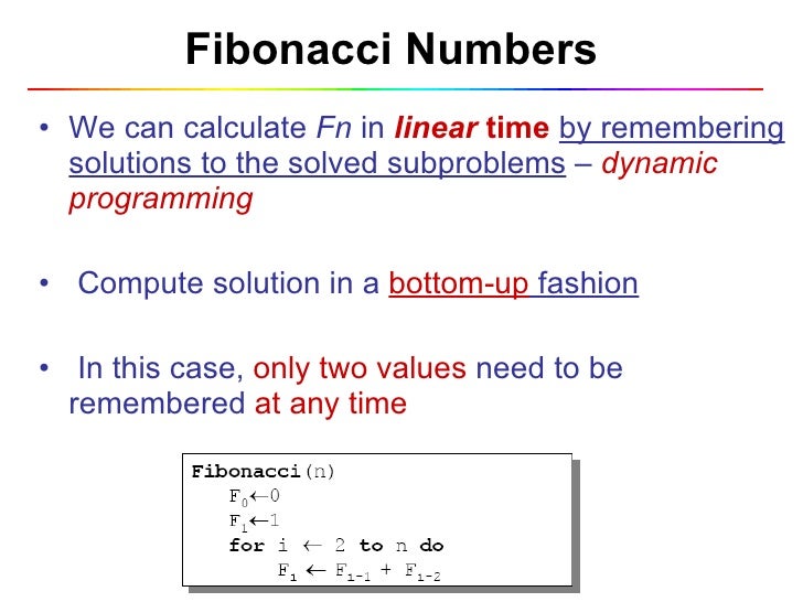 19. 19. Fibonacci Numbers <ul><li>We can calculate Fn in linear time by remembering solutions to the solved subproblems – dynamic programming </li></ul><ul><li>Compute solution in a bottom-up fashion </li></ul><ul><li>In this case, only two values need to be remembered at any time </li></ul>