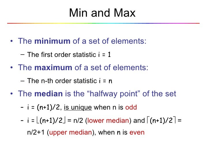 2. 2. Min and Max <ul><li>The minimum of a set of elements: </li></ul><ul><ul><li>The first order statistic i = 1 </li></ul></ul><ul><li>The maximum of a set of elements: </li></ul><ul><ul><li>The n-th order statistic i = n </li></ul></ul><ul><li>The median is the “halfway point” of the set </li></ul><ul><ul><li>i = (n+1)/2 , is unique when n is odd </li></ul></ul><ul><ul><li>i =  (n+1)/2  = n/2 ( lower median ) and  (n+1)/2  = n/2+1 ( upper median ), when n is even </li></ul></ul>